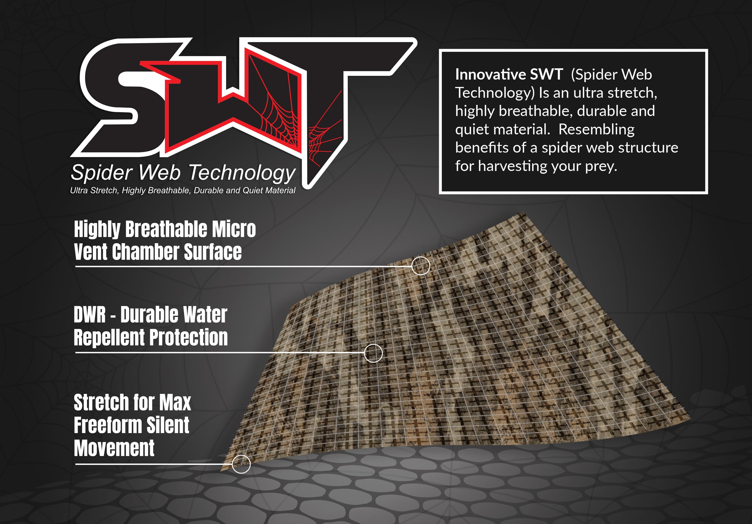 Resembling the benefits of a spider web structure for harvesting your prey, our innovative SWT Technology includes a highly breathable micro-vent chamber surface, durable water-repellent protection, and stretch for maximum freeform silent movement. We've got you covered for your most successful turkey hunt yet.